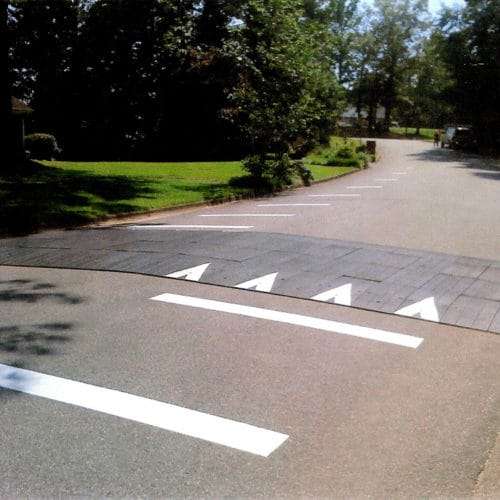 Our RubberForm Speed Tables are carefully innovated to solve these problems. They’re blessedly simple to install: no large crews, no heavy equipment, no road closures. They’re gentler than speed bumps and won’t damage vehicles as they cross. In fact, speed tables are often used as crossings for pedestrians when the sidewalk can connect.